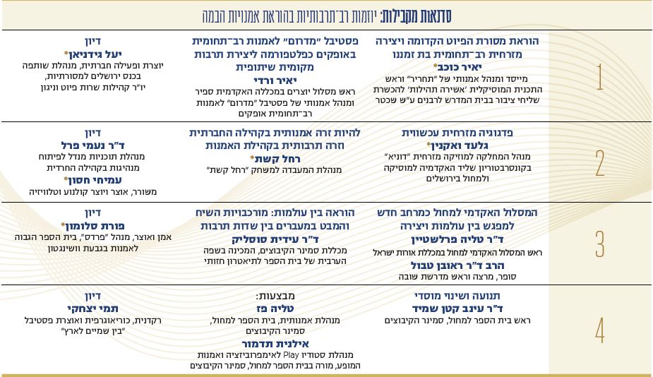 גלעד ואקנין, מנהל המחלקה המזרחית "דוניא" בקונסרבטוריון שליד האקדמיה למוסיקה ולמחול בירושלים, דיבר על החשיבות של פיתוח "פדגוגיה מזרחית עכשווית" להוראת מוזיקה לתלמידים. ואקנין תיאר את הפער בין הוראת המוזיקה במסורת המערבית ובמסורת המזרחית, ואת השיטה שפיתח ב"דוניא" להוראת מוזיקה. כך למשל, ההוראה כוללת מאפיינים קבוצתיים ושיתופיים, שבה כל אחד מהתלמידים מנגן בכלי אחר, והמורה מנגן יחד עמם. רחל קשת, מנהלת "המעבדה למשחק" תיארה את המתח שסטודנט לתאטרון מהעולם הדתי חש בין לימודי תאטרון במרחב הטרוגני מעורב של גברים ונשים לבין הלימודים במרחב נפרד – הומוגני הן מבחינה דתית והן מבחינה מגדרית. ד"ר עידית סוסליק העלתה תובנות מהוראת מחול במרחב חילוני ובמרחב דתי, ואילו יאיר ורדי, ראש מסלול יוצרים במכללה האקדמית ספיר, תיאר את פסטיבל "מדרום" לאמנות רב-תחומית באופקים כפלטפורמה ליצירת תרבות מקומית ושיתופית.